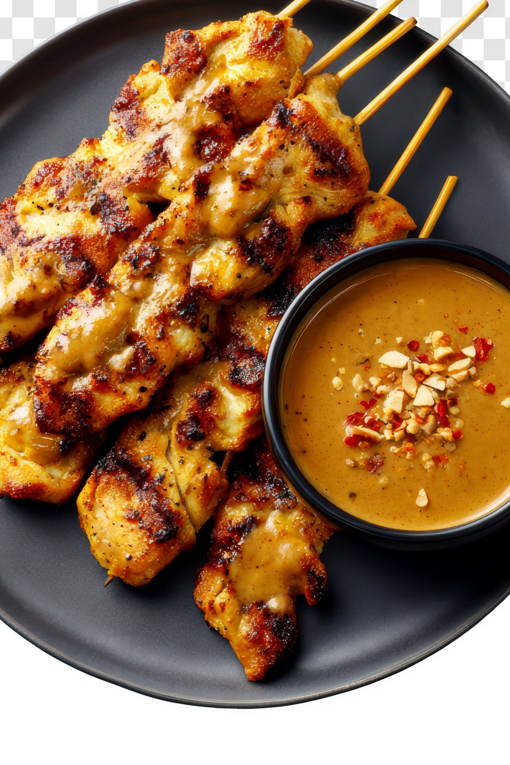 Arrange the grilled Chicken Satay on a serving plate and serve it hot with the peanut dipping sauce on the side.